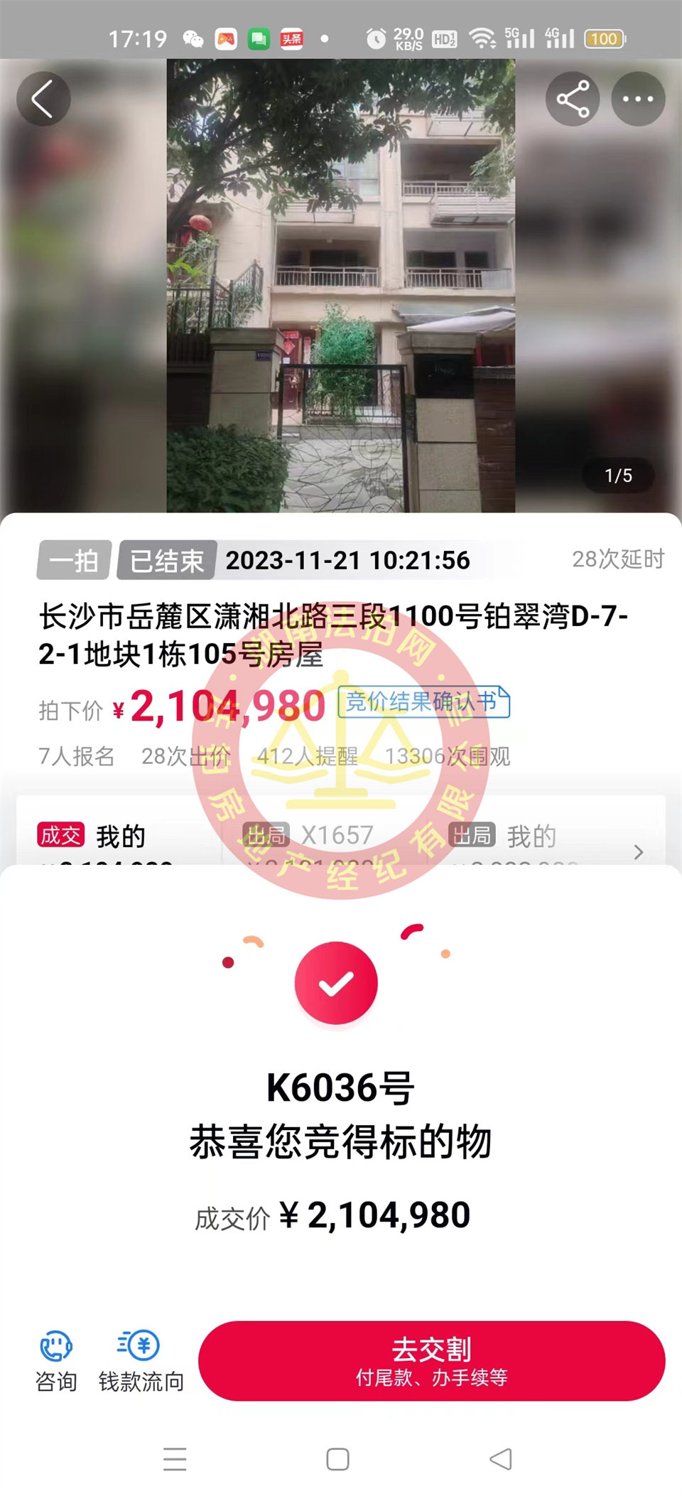 張姐是我公司(湖南法拍網(wǎng)法拍房地產(chǎn)經(jīng)紀有限公司)188位VIP客戶,9月中旬簽約委托的,本來沒資格才來買法拍房的,結(jié)果剛把合同一簽,長沙放開限購有資格了。然后準備不買法拍了,去看新房二手房,后面一看新房的售價和位置,果斷還是認可我的投資理念,還是要通過法拍撿漏才能跑贏通脹才能賺錢。于是繼續(xù)看法拍房,中間看了十多套房,參拍了四五套(最后成交價其實都撿漏的,只是漏不大或者張姐不太喜歡那房子就都沒拍了,比如麓陽和景雅苑那套撿大漏了,但是張姐不喜歡),比較喜歡鉑翠灣這套帶院子的房子,也得虧我們給力有把握搞定后續(xù)事情,所以直接就干了下來,3個月拍好了房子。