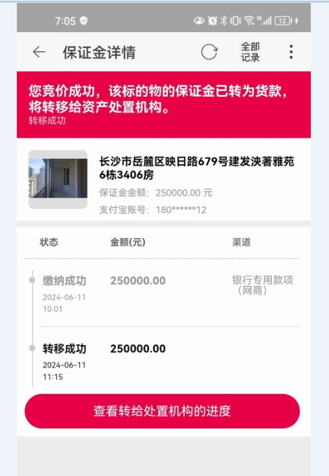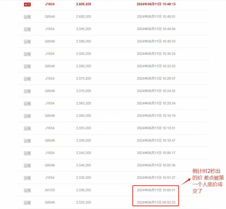 趕緊準備保證金報名(因為錢在理財,還讓我BB轉給我的保證金),轉進來已經10點了,我報名的時候已經10點01分了,差點我就沒拍的機會了,第一個出價的Q8646差點底價成交了,在倒計時4秒的時候,另外一個A5120(恩人)出了一手價給續(xù)命了一下若A5120不出價,Q8646直接底價成交,給了我?guī)追昼姇r間讓我能報上名出價(如沒我去搗亂拍,就是Q8646撿漏),最后讓我給260.5萬拍下來了,只能說真的太幸運了。
