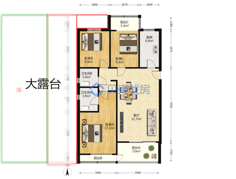 最大的亮點是露臺,露臺怕有兩三百個平方,蓋瓦的部分應該不能用,但實際能用的位置也有四五十平,真的爽。