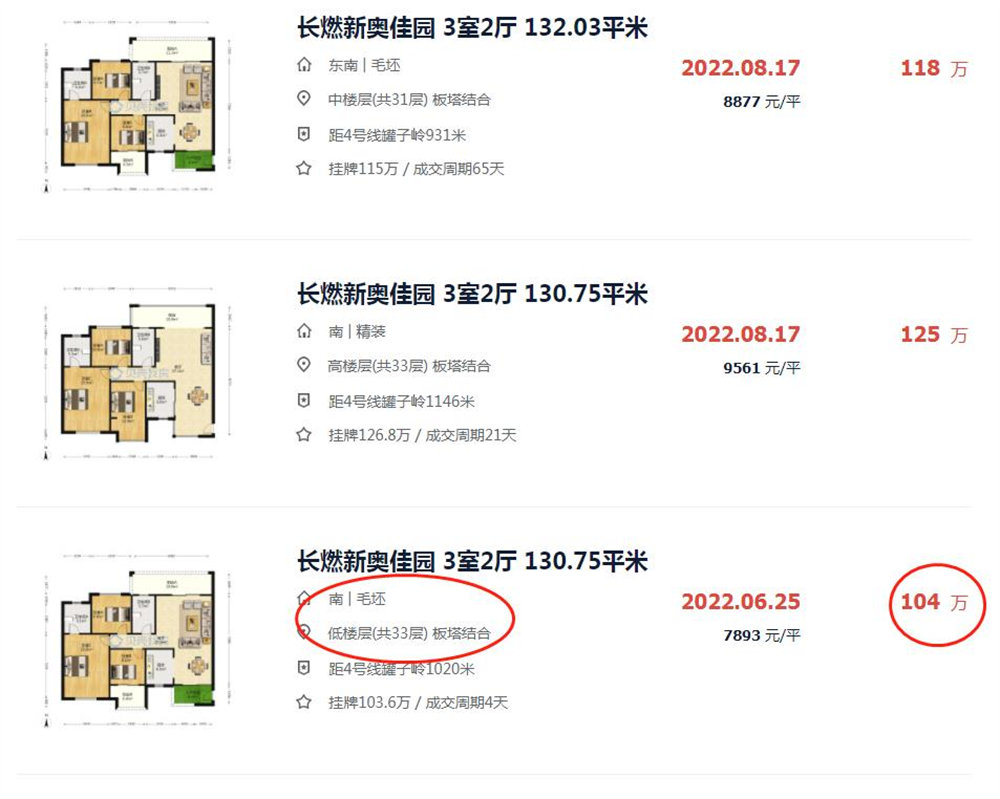因為貝殼二手房上低樓層的二手房毛坯成交價都是104萬(見圖三),咱這套低了十多萬,還是帶裝修的。